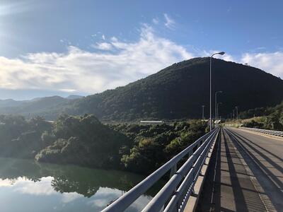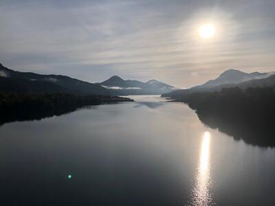 朝日が水面に映える,七ヶ宿ダムの美しい風景がありました。