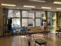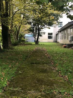 七校校舎前の中庭では,木々の葉に当たる静かな雨音が