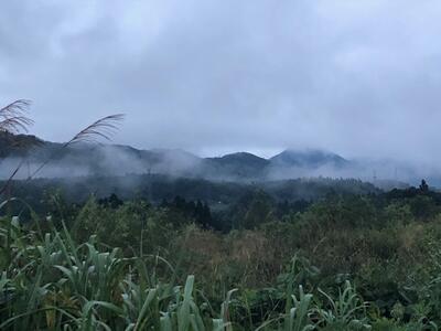 細かい雨が降り続き,山の方面に霧のようなものが見えます。