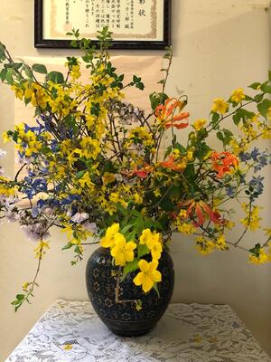福寿草を見つけ,鮮やかな色を見つめながら,豊かな心持ちに