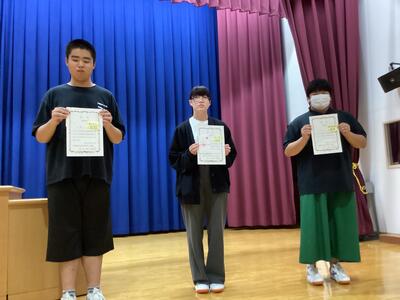 審査結果 最優秀賞 1年 髙野 葵さん 優秀賞 2年 庄司 悠力さん、3年 我妻 華さん