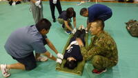 担架搬送訓練の様子 緊縛止血法訓練の様子 代表生徒2年生4名