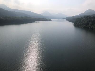 早朝の七ヶ宿ダムです。穏やかな青空と湖面であります。
