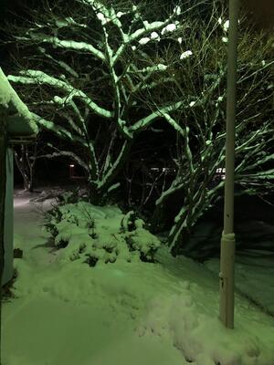 校舎の玄関前です。雪明かりも,きれいなものです。
