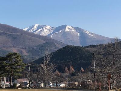 澄み渡る青空に映える不忘山。私たちを見守っています。