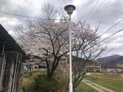 校舎の前にある七校桜です。遠目には,わかりにくいですが……