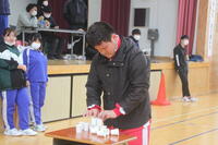 (紙コップを1人1つずつ積む。