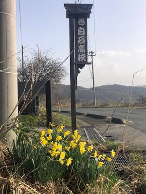 学校の入口に目を向けると,スイセンが仲良く咲いていました。